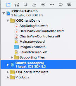將下載檔案解壓縮,並且複製Charts 檔案夾,然後在你的專案 (iOSChartsDemo) 的根目錄貼上它。在Finder 打開這個Charts檔案夾,並拖曳 Charts.xcodeproj 至Xcode專案中。如下圖所示。